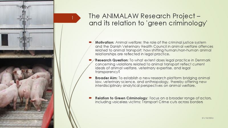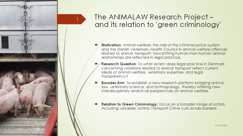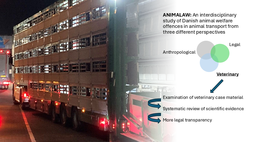"ANIMALAW is an interdisciplinary study of animal welfare offences in Denmark focusing on animal transport cases. A number of cases from the past 10-20 years will be descriptively analyzed based on veterinary science with attention to e.g., type of clinical condition, and type of evidence presented. Based on the results, one (or more) high-incidence clinical condition will be selected, and scientific evidence for negative affective states and animal welfare will be systematically reviewed. The insights gained from this analytical work will be used in the overall study to create more legal transparency.”